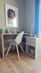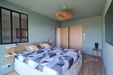 => a second bedroom measuring 13m² with a double bed (140x190cm) + desk and Mac computer available if needed + closets + 7m² balcony overlooking the scrubland, sea, and sunsets