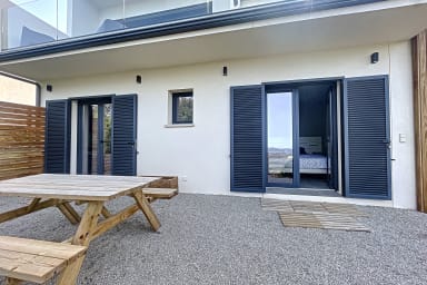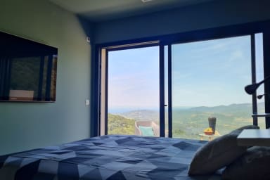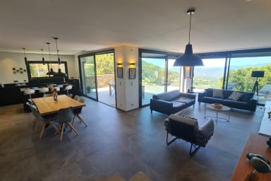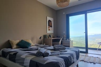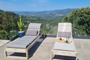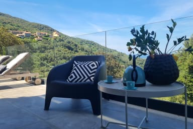 Magnificent high-end air-conditioned villa with sea view and a one-bedroom annex located in the village of Sollacaro offers comfort, beautiful amenities, and tranquility while remaining close to the sea, water sports, sports, cultural activities, etc.