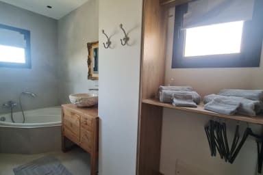 => A spacious 20m² master suite with a private 11m² balcony overlooking the scrubland, sea and sunsets, comprising a very large 180x200cm bed, large flat-screen TV, bathroom with bathtub, sink unit, mirror, towel dryer and storage space.