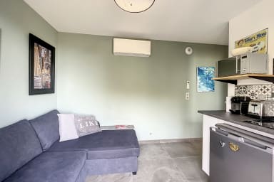 => a main room with open-plan fitted and equipped kitchen (microwave, refrigerator, hob, coffee machine, etc.), a lounge area with sofa, wall-mounted TV
